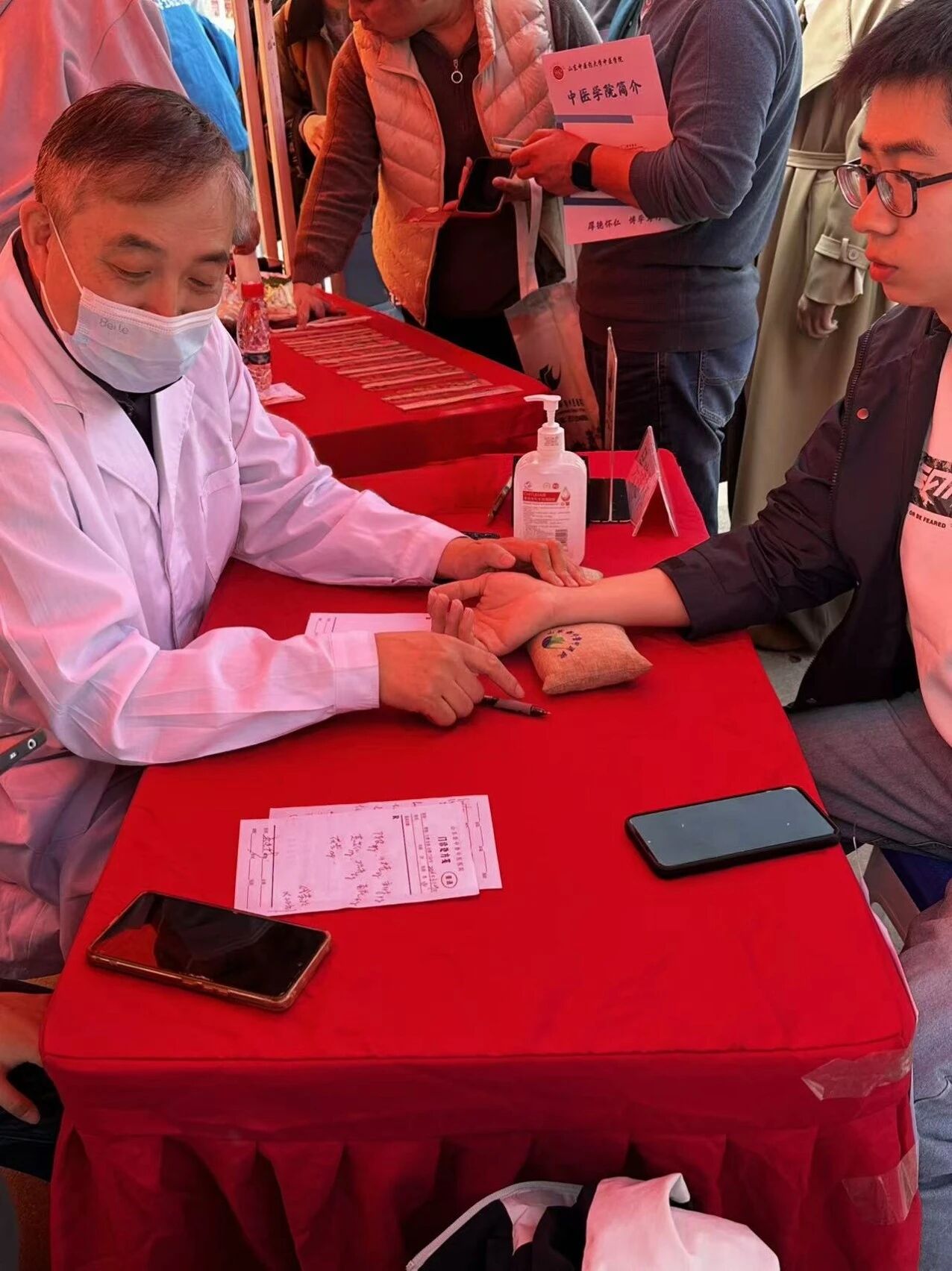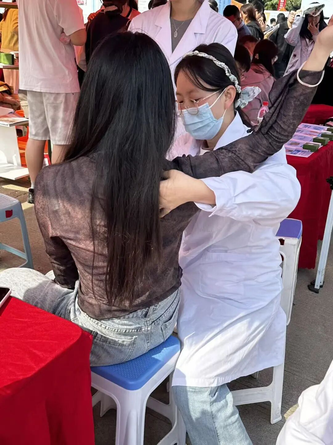 志愿者团队在中医适宜技术摊位开展推拿、耳穴压豆等服务,用传统技法为奔波的师生舒缓压力,让中医药文化赋能求职现场。